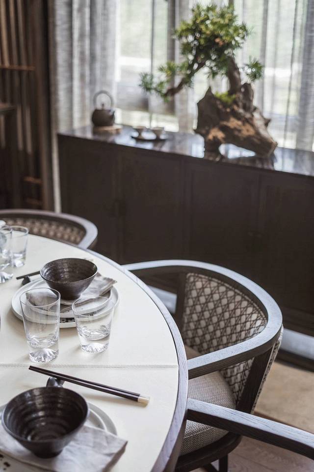 餐厅设计不仅延续了含蓄、高雅的生活方式与礼制之道,提炼出经典元素加以简化和丰富,圆形实木餐桌更显简约与流畅,人性化布局搭配触感顶级的材质,营造安静、舒适的用餐空间。
