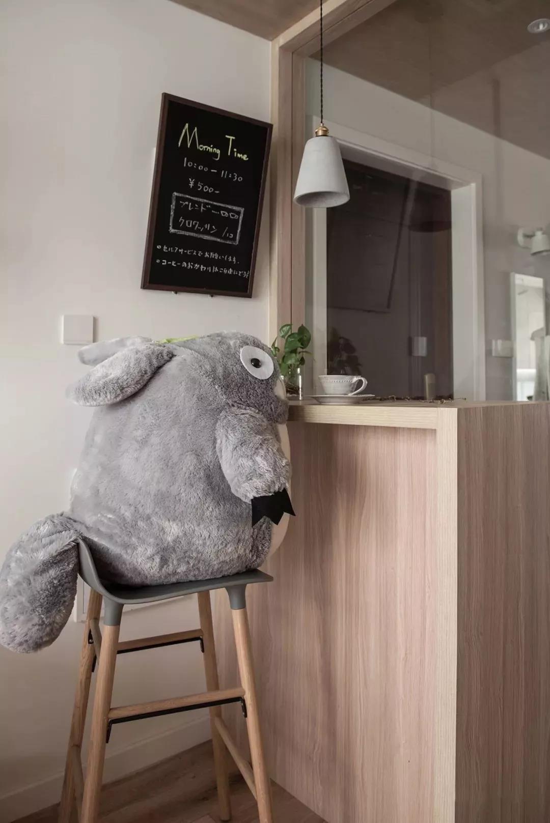 电视背景墙是木质板面刷上水泥漆打造的,一侧是卧室的门片。隐形卧室门片与背景墙浑然一体,如果不是门上有把手,想必很多人都看不出来这是扇门吧!