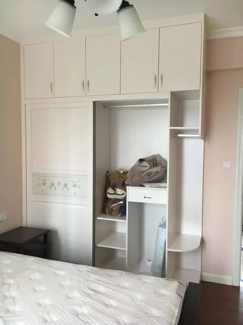 30、这个卧室衣柜取消以收纳架+收纳篮,床侧边则是做个腾空的书桌,非常的方便。