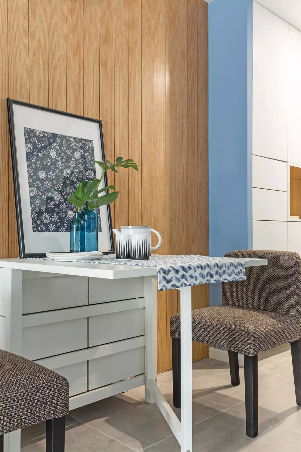 客厅墙面通过白色与灰蓝色的经典搭配营造出现代简约的理性之美。