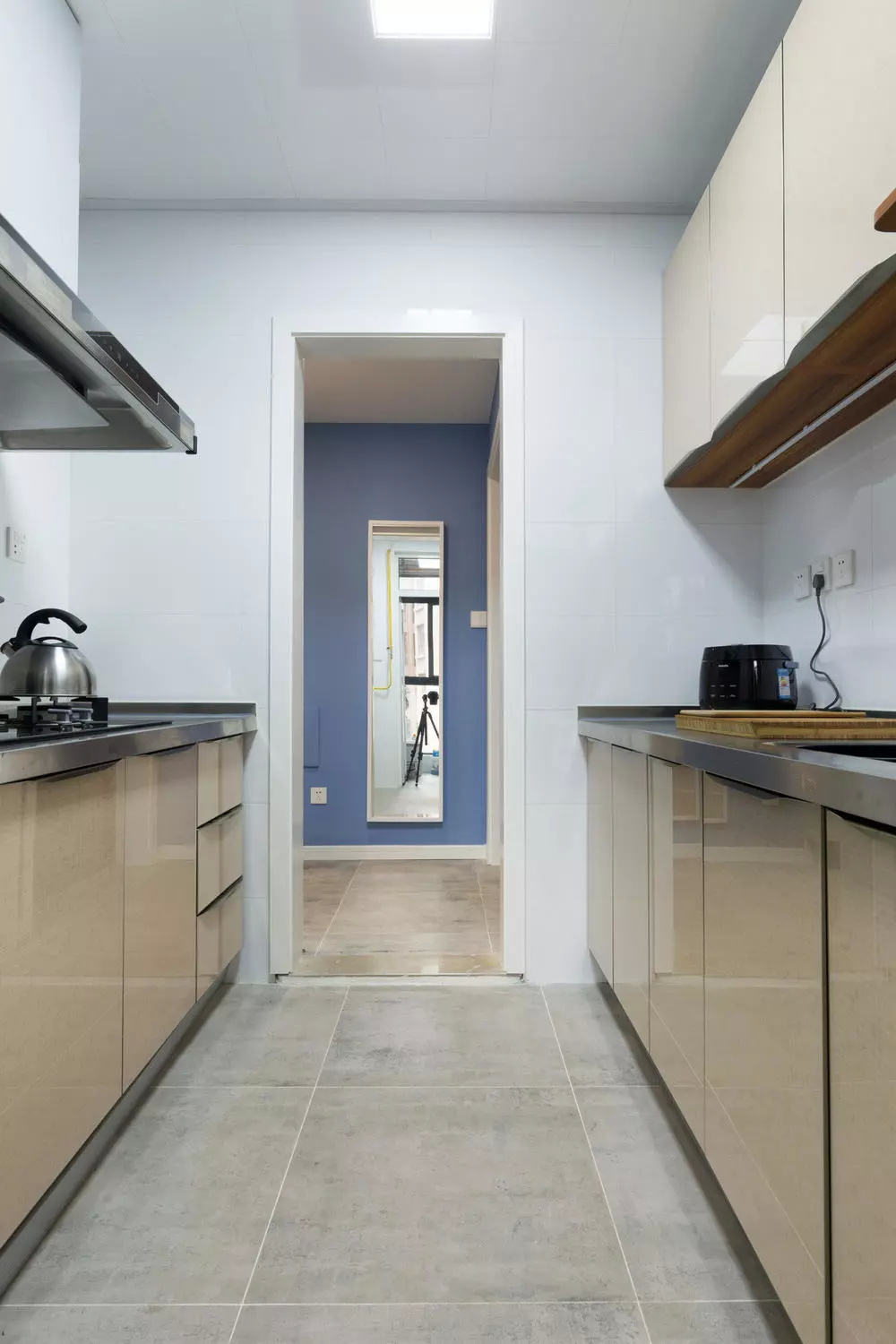 厨房的空间十分有限,因此平行橱柜的的设计极大地增加了台面的利用率和储物功能,也很好的留出了操作通道