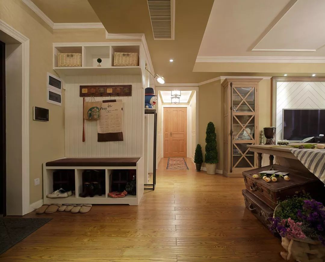 3、鞋柜、换鞋凳、挂衣区和收纳区的一体化设计,显得整洁大方之余也提高了空间利用率。