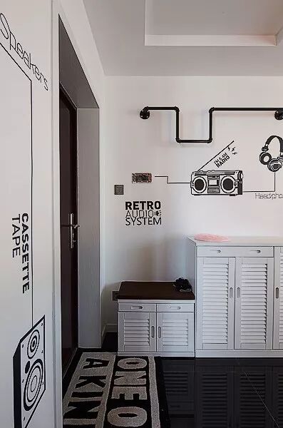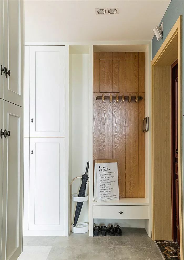 1、进门墙面是衣钩架+换鞋凳,特别实用的组合。