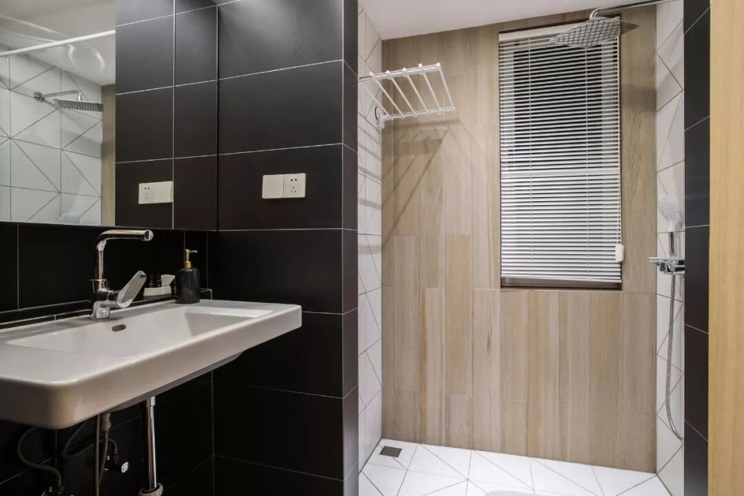 69、整体小白砖的基础上,用浅灰色乳胶漆划分出镜面柜的区域,让功能分区更加明确。