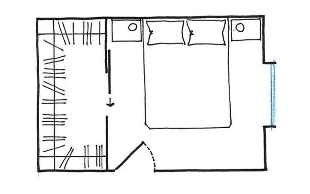 如果卧室面积不大,且呈长方形的布局,可以利用较长一面墙设计一个“一”字型的衣帽间,一样能实现你对衣帽间的所有储物需求。