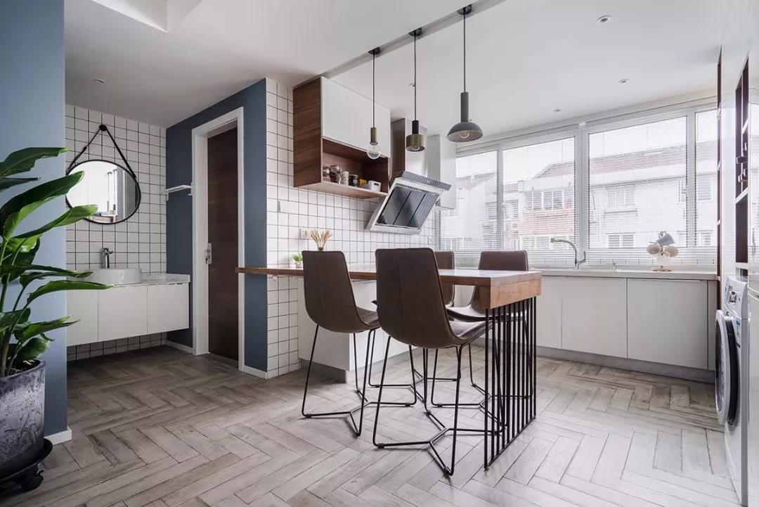一块实木板子搭在橱柜上就成为了三口人的餐厅,好看实用又节约地方,还起到了划分客厅与厨房空间的作用。
