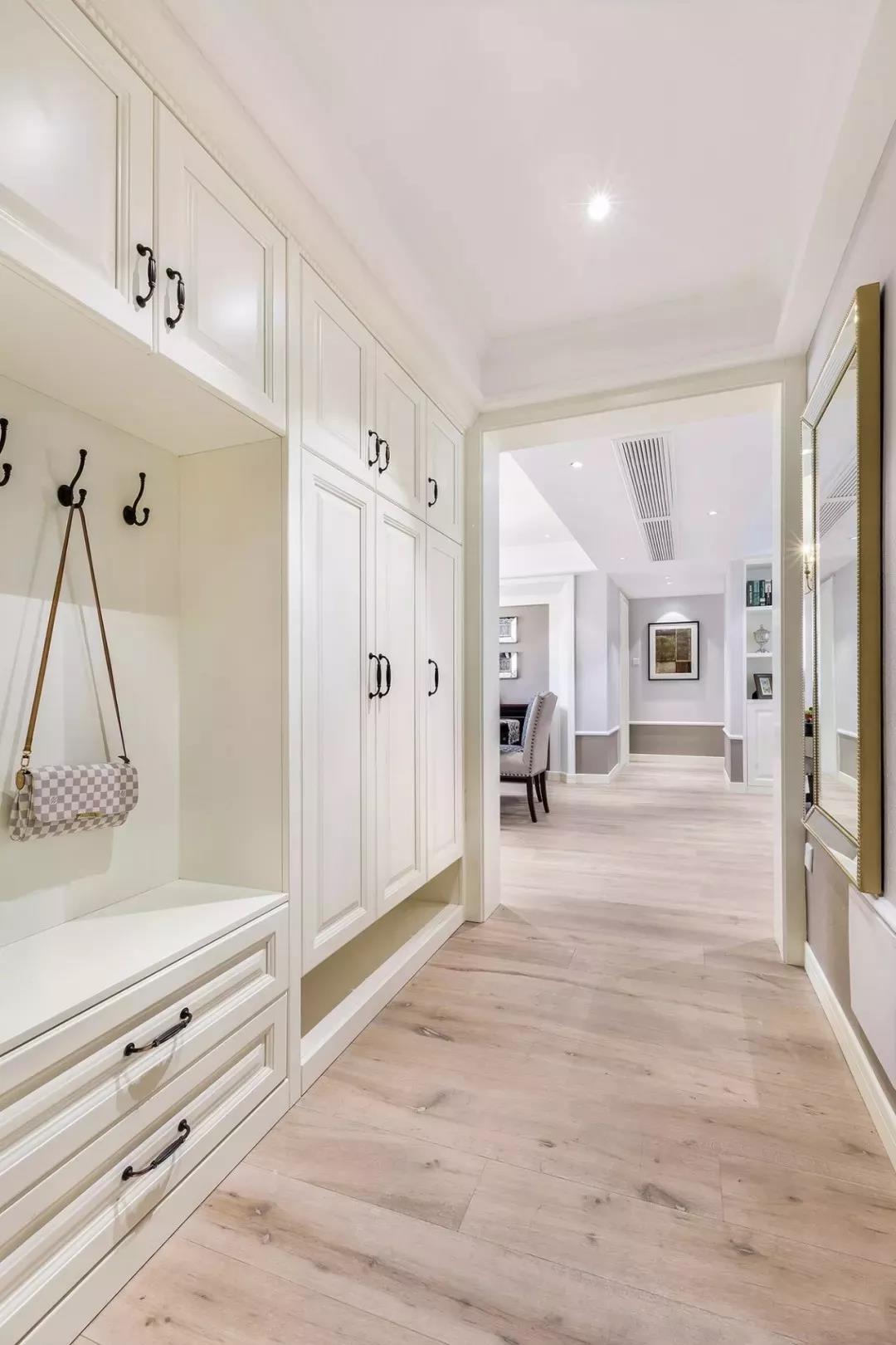 玄关面积宽敞,屋主安装了一整面墙的组合衣柜,既能当鞋柜用,又能作为衣帽区,大面积的收纳非常实用。