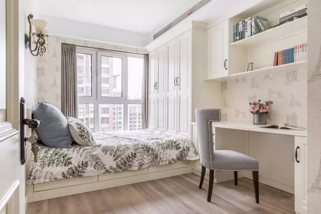 白色家具使整个空间散发着宁静、祥和的气息,倚窗设计榻榻米,转角就是书桌,既可当卧室用,也能兼作书房。