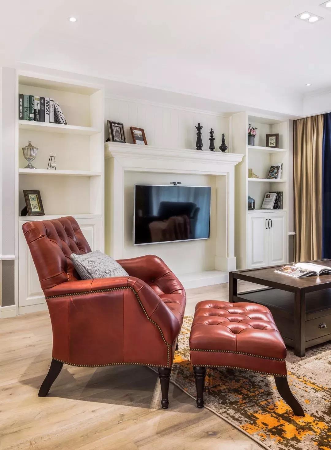 对称电视背景造型,壁炉造型为空间增添几分美式格调,左右两侧储物格方便展示与储物。