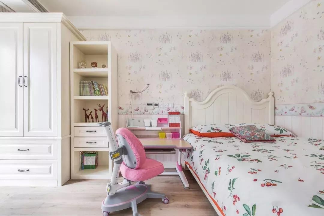 儿童房,浅木色地面搭配浅色印花壁纸,樱桃图案床单有趣可爱,非常符合小孩子的审美。