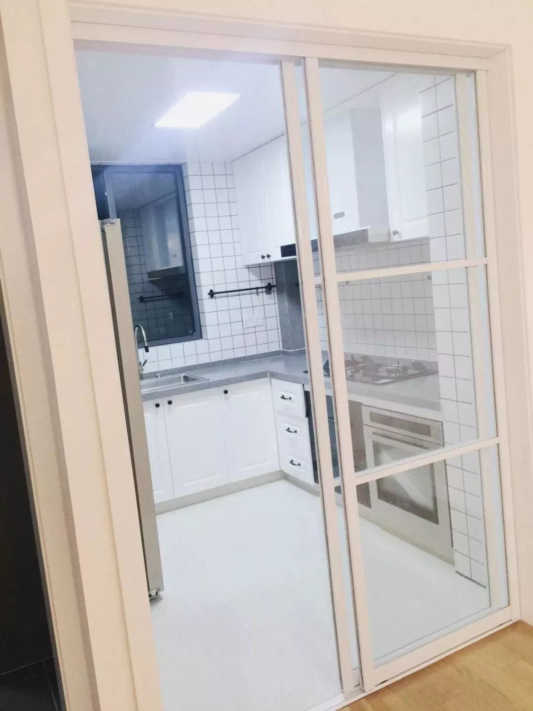 厨房门是客餐厅与厨房交接的窗口,这个门一般都是以玻璃推拉门为主,这样可以为在保持空间的通透的同时,又隔断油烟对公共空间的侵袭。