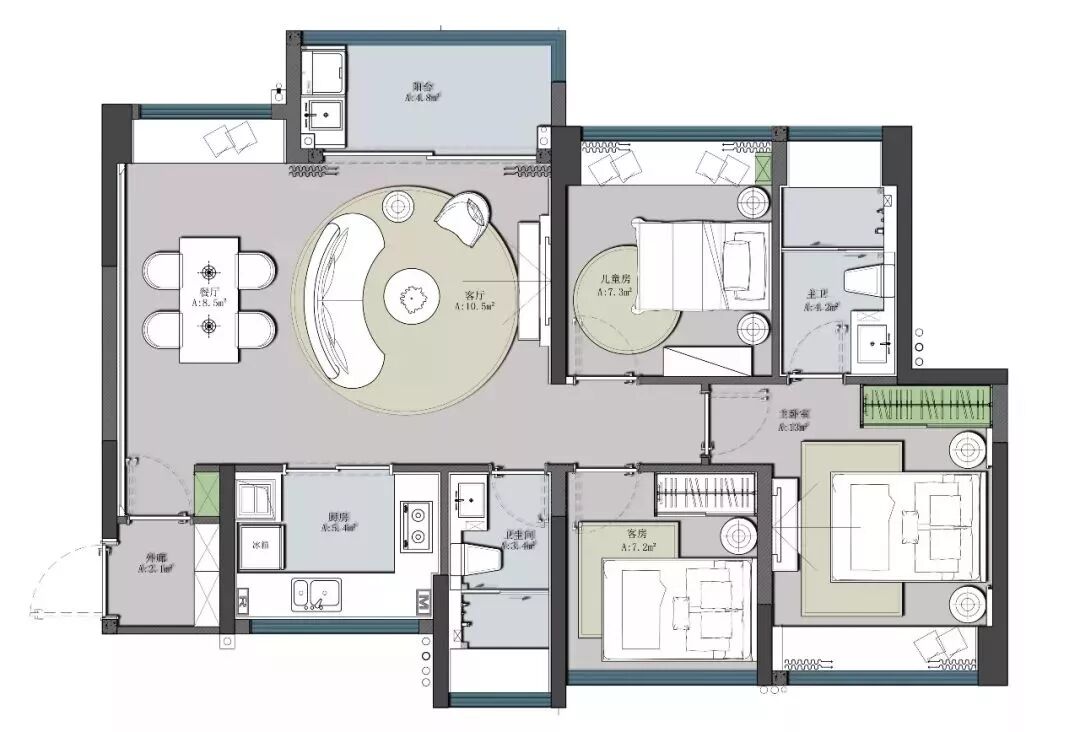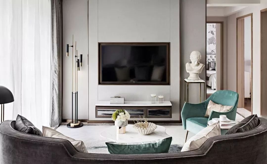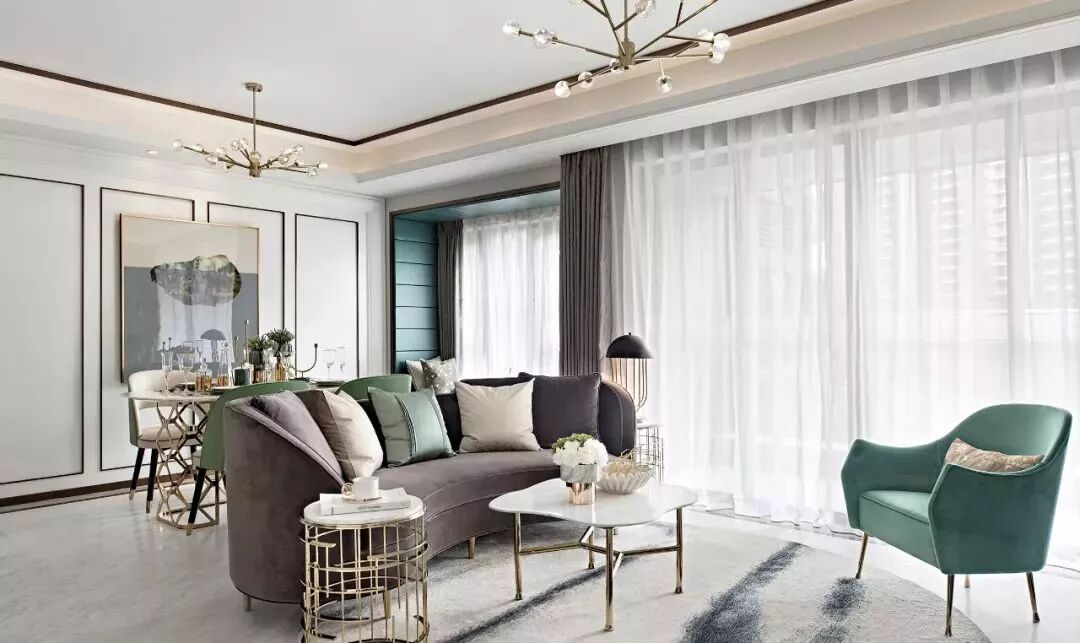 弧型的布艺沙发把客厅和餐厅分开,大理石和金属结合的茶几、边几搭配青绿色的休闲椅,让客厅变得更加的精致、浪漫。