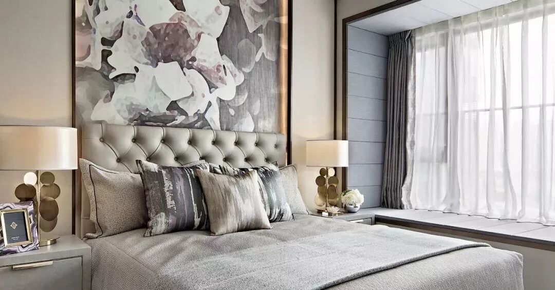 对称的主卧布局,简雅大方的床铺,素色的床头背景墙搭配大幅面的花卉装饰画,飘窗做了深灰色的软包处理,搭配灰色窗帘和绿意抱枕,整体给人以素雅舒适的休憩氛围。