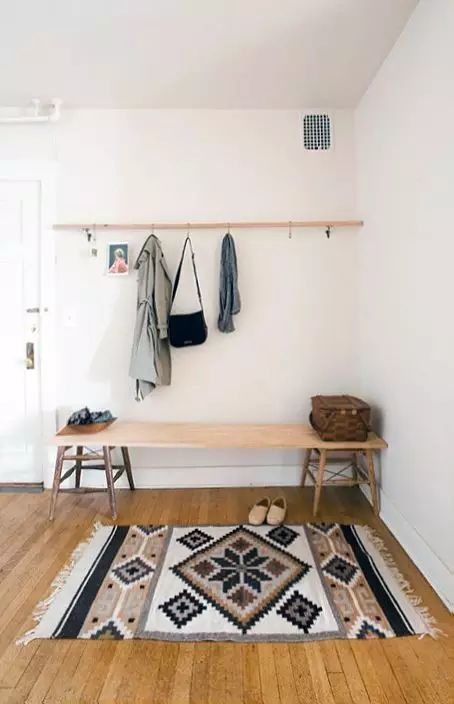 当然,还可以自己运用天然材料在玄关墙面上做文章,比挂衣柜实用便宜一百倍,小木桩固定在墙面上,进门挂衣服帽子没问题,安低一些鞋子都能挂。
