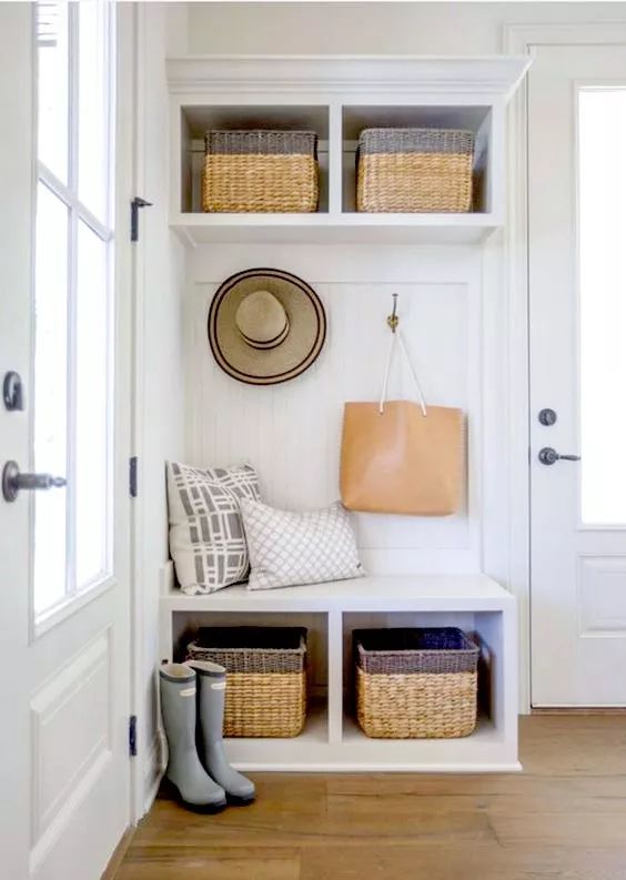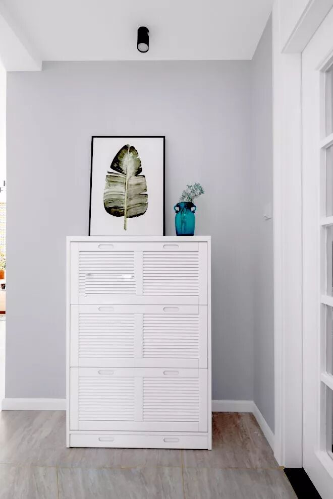 如果家里常住的人数不多的话,更建议只装隔板架,其它的比如板凳或挂钩就不要布置了,直接留白,这样既可以保持空间的通透,整个空间的视觉也会有扩充的效果。