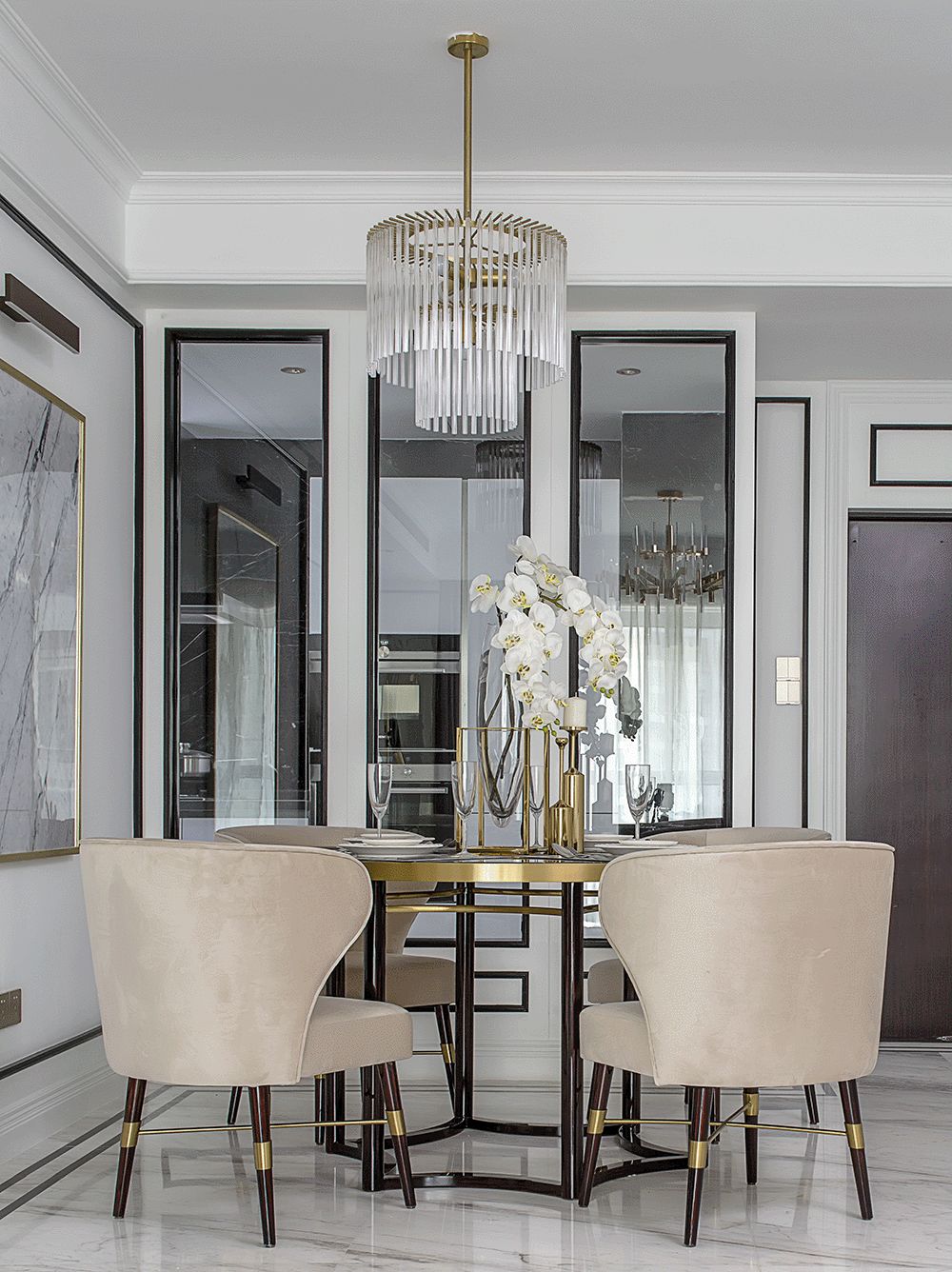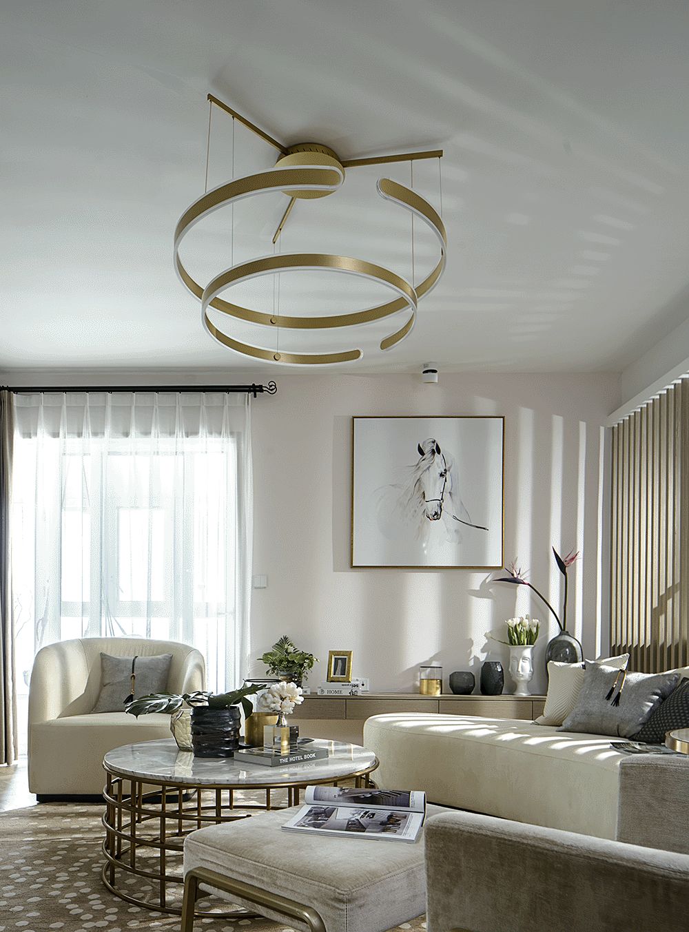现在最火的轻奢元素,莫过于黄铜和大理石这对热门cp了。黄铜的高级质感搭配大理石的温润内敛,在视觉上可以形成一股极强的艺术张力,轻松打造一个时尚精致的现代家居。巴黎故事在色彩运用上,设计师特意选择了优雅大气的米杏色作为主调,它的颜色十分柔和,比白色更多了几分温暖和高贵。同时,“雾霾蓝”和赭石色的局部点