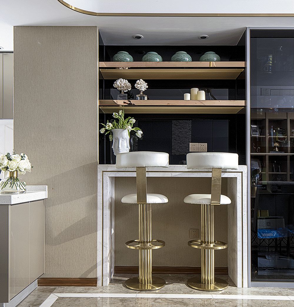 在以咖、灰、金为主色调的空间氛围中,亮眼的撞色搭配更有利于营造出一种活泼轻快的氛围,和谐又有层次感,充分满足了轻奢族对于品质居住的完美想象。