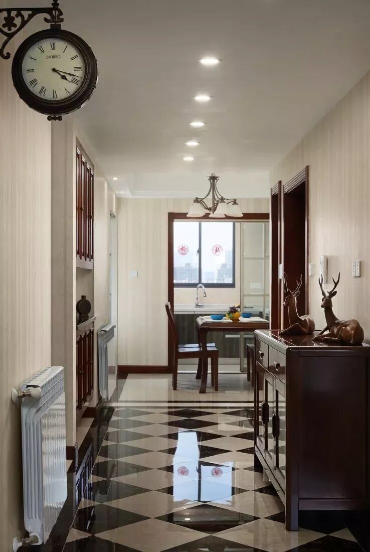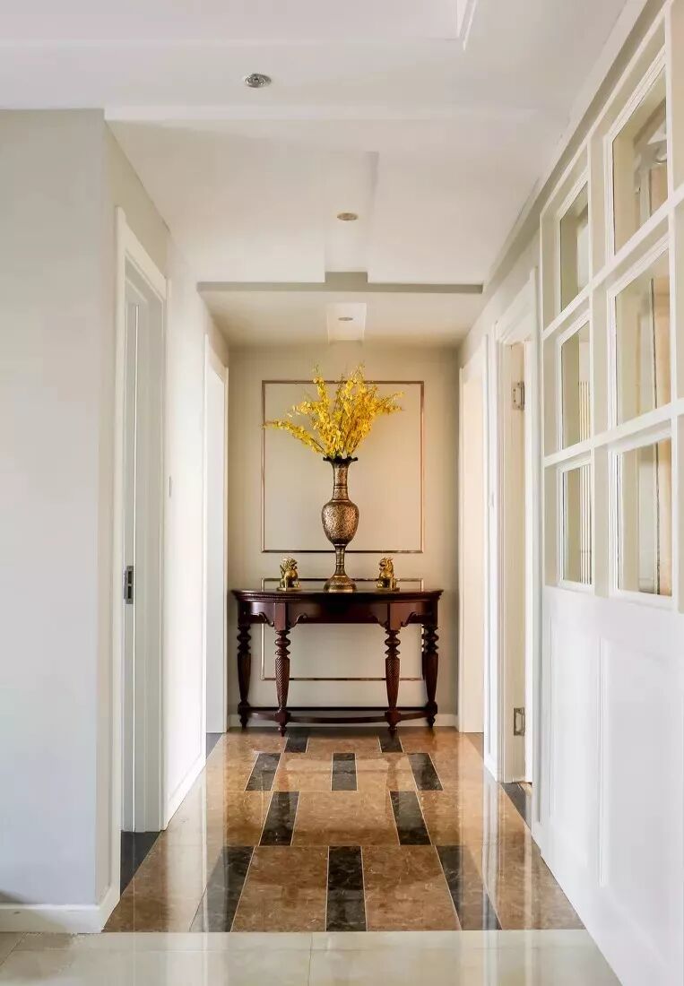 过道空间一般都比较狭窄,所以会比较空洞,除了墙面的装饰画,能为这个空间增加趣味性的也就是地面了,所以这里的地砖简单做个拼花造型,也会让这个空间不显得那么单调。