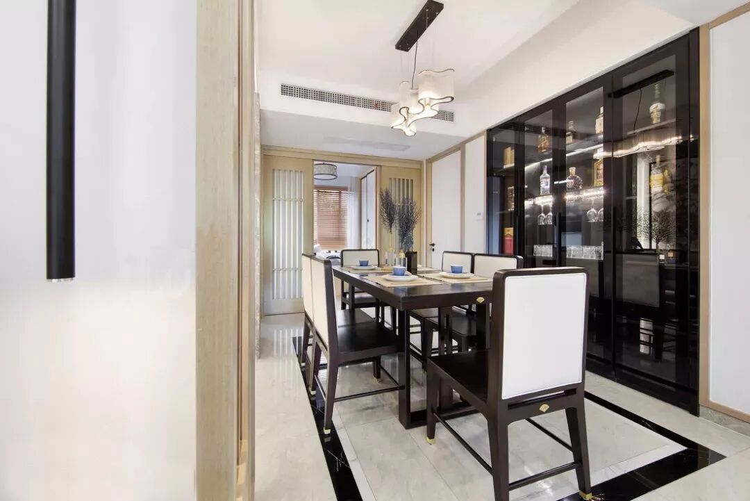 餐厅与客厅一样,通常都是打通的统一空间,在餐桌区域做一个拼花造型,也可以让餐厅显得更加层次精致。