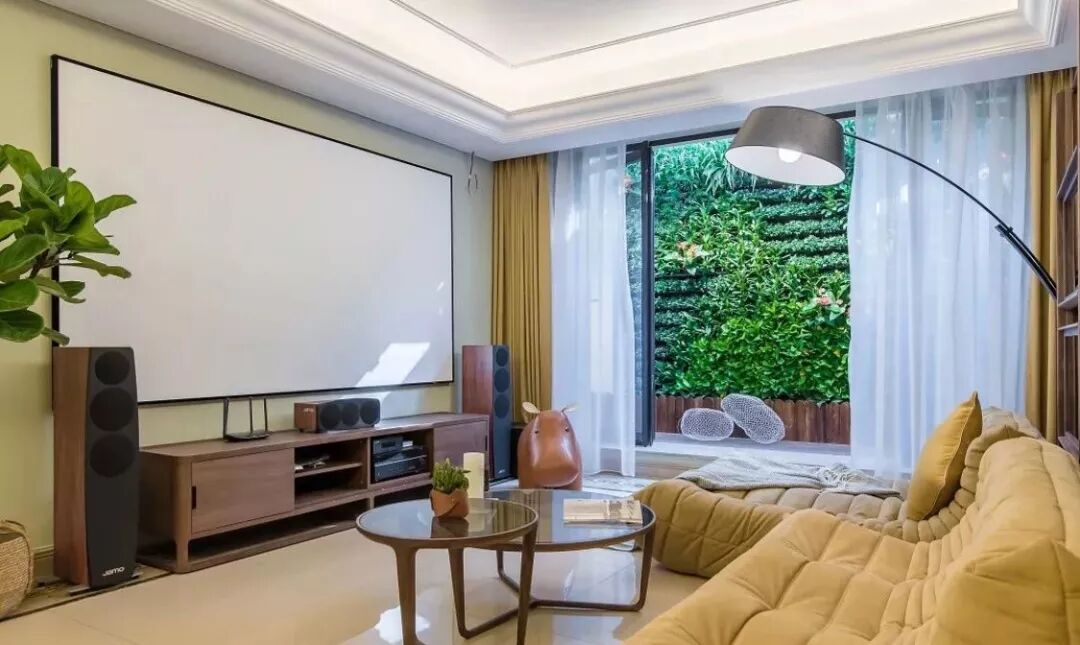 如果是超级影迷,那么就可以考虑在电视墙装上效果更好的抗光幕布,再搭配上一款激光投影仪的话,哪怕是白天开窗的观影效果都是妥妥的了!