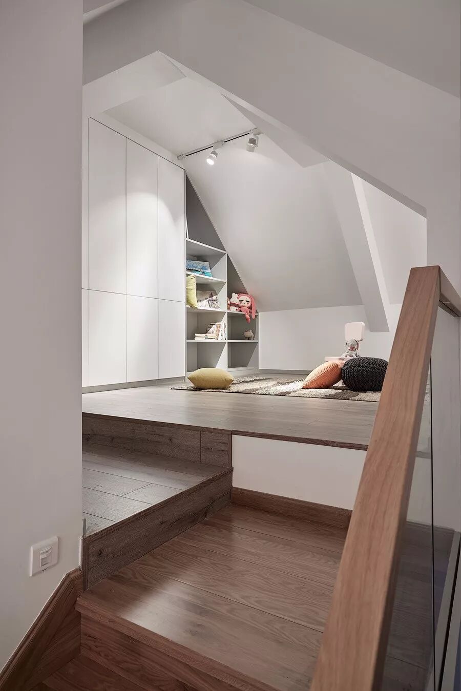 阁楼是孩子的玩耍天地。木地板铺上毯子,小脚丫踩在上面会特别的舒服。侧面是柜子,用来摆放孩子的一些玩具正正好。
