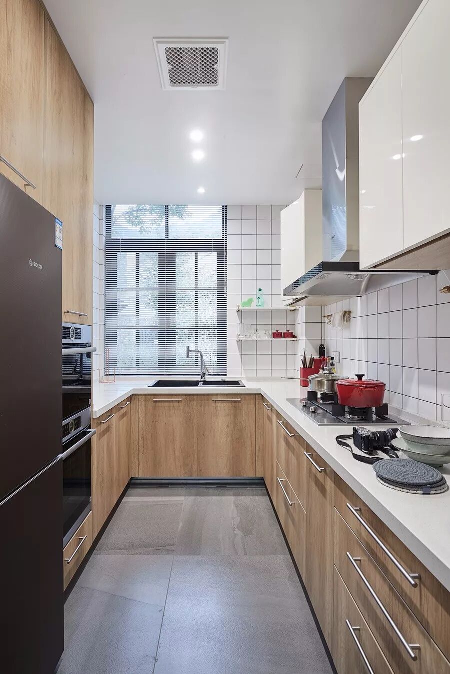 U型厨房,纯白+原木+浅灰的搭配,不仅视觉上看起来舒服,也非常的有层次感。冰箱、烤箱融入其中,大大提高空间的利用率。