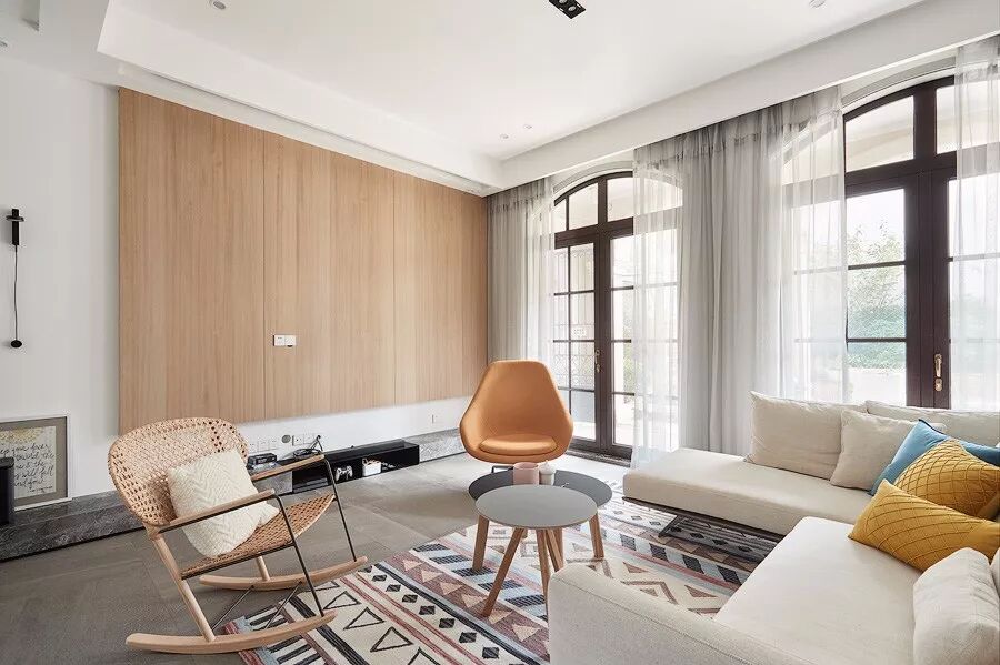客厅是非常休闲的搭配,米色沙发配上几个暖色抱枕,再搭配几何图案的多彩抱枕,真的特别温馨。