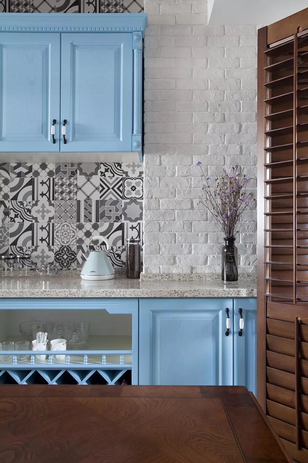 灰蓝色的橱柜搭配白色文化砖,在设计师的手笔下显得质朴而又素雅。像是空间中一道不可或缺的艺术品。