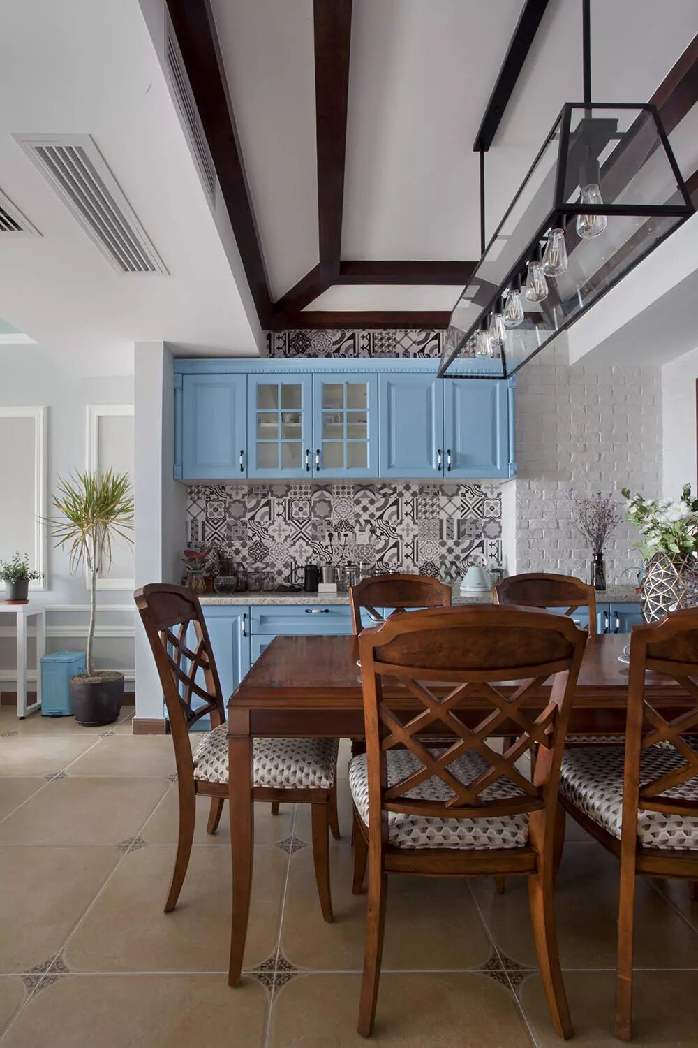 中厨区域被完全隔离到里面,延展出5米多长的橱柜,让忙碌的光荣劳动者,在里面能完全耍得开。浅蓝的柜板延续西厨用色一脉相承,搭配地面的墨绿色仿古砖,感觉还满惬意。