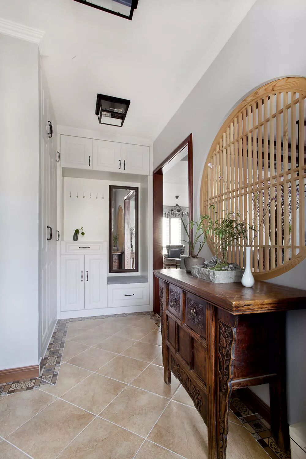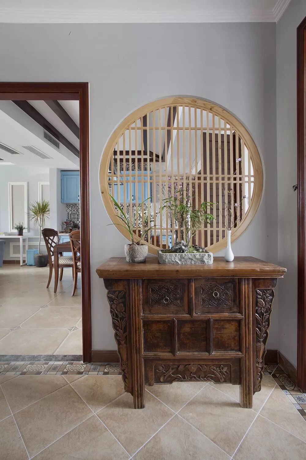 家里有来客,站在门口的时候就一眼看全室内的情况是很多人会比较忌讳的。圆形的小格栅窗效果还不错,既有遮挡性,还不显得那么闭塞。靠在窗下的玄关柜,是屋主海淘来的南亚风格产物,尺寸刚好。