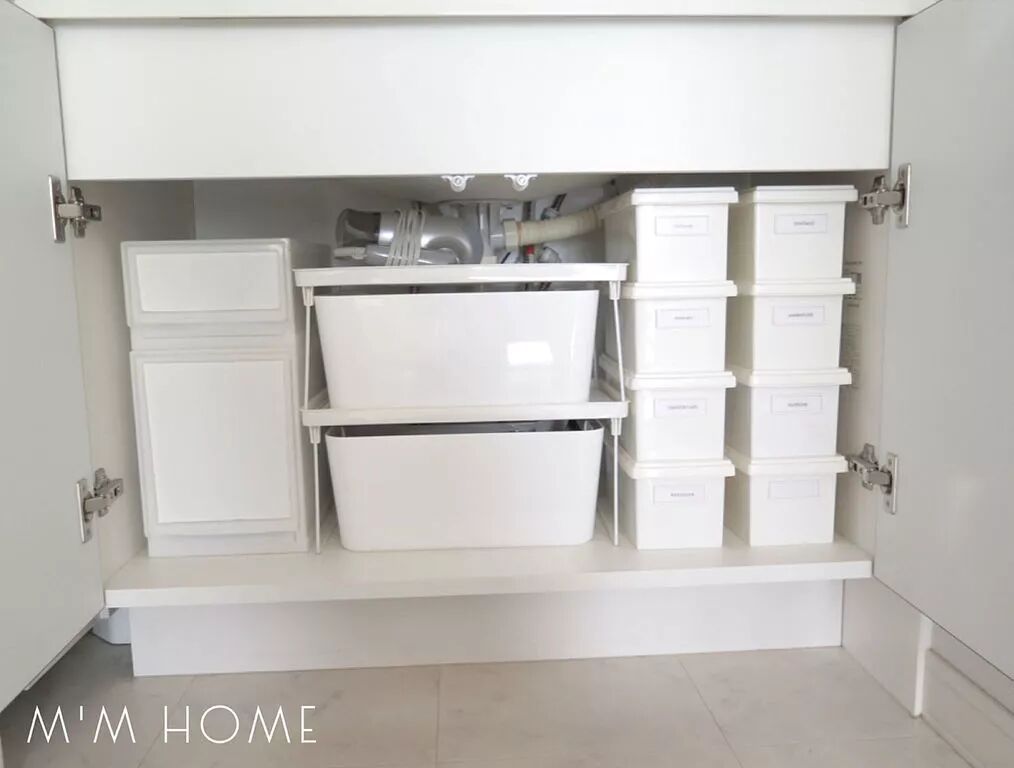 水槽柜下方用白色置物架和收纳盒收纳杂物,统一的颜色使狭小空间显得简洁明亮