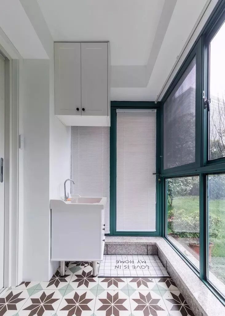 如果要在阳台摆放洗衣机的话,那么收纳柜跟洗衣机组合起来摆放也是相当常见也不错的方案,通过巧妙的结合,会让阳台更加实用简洁。