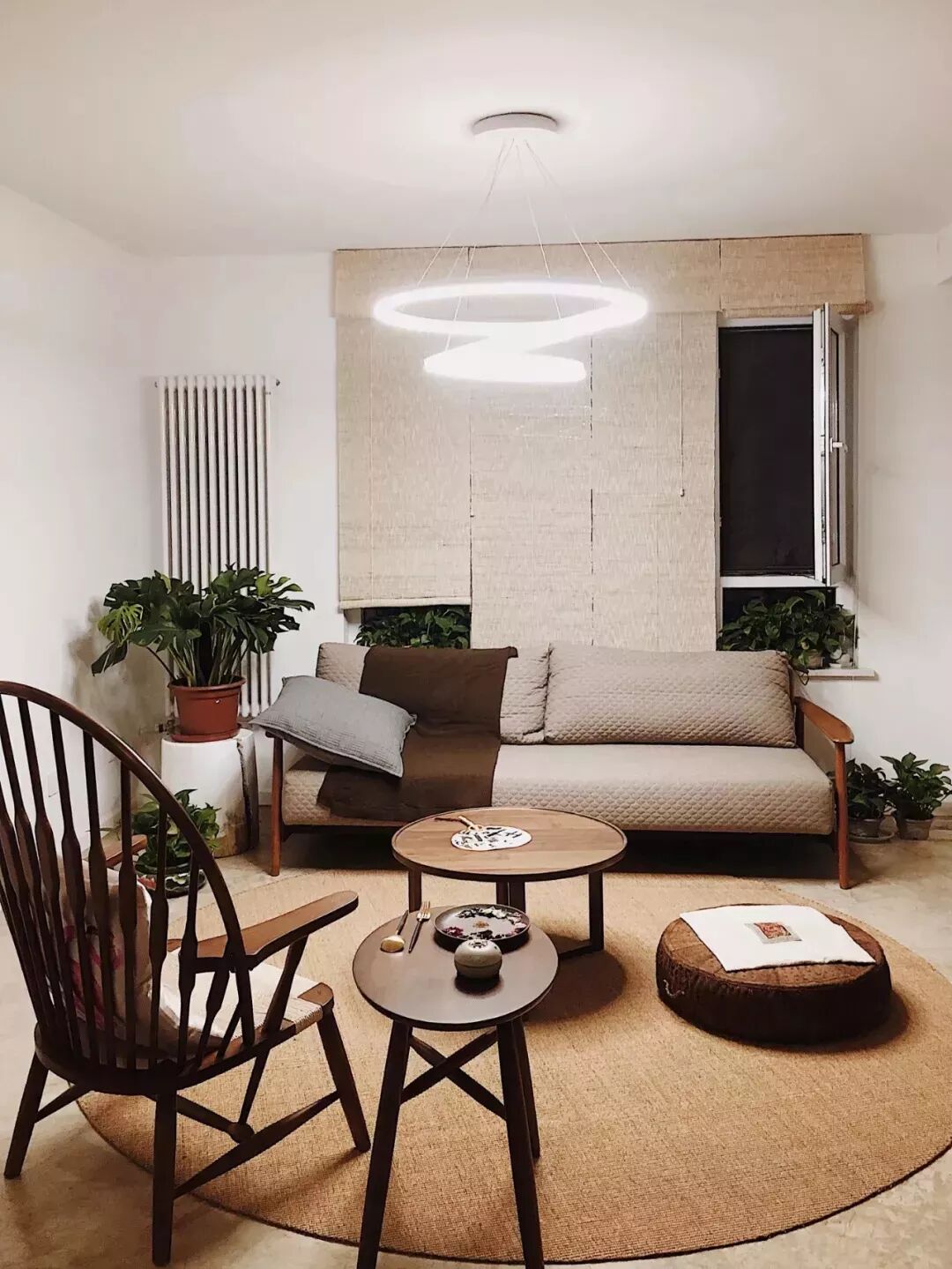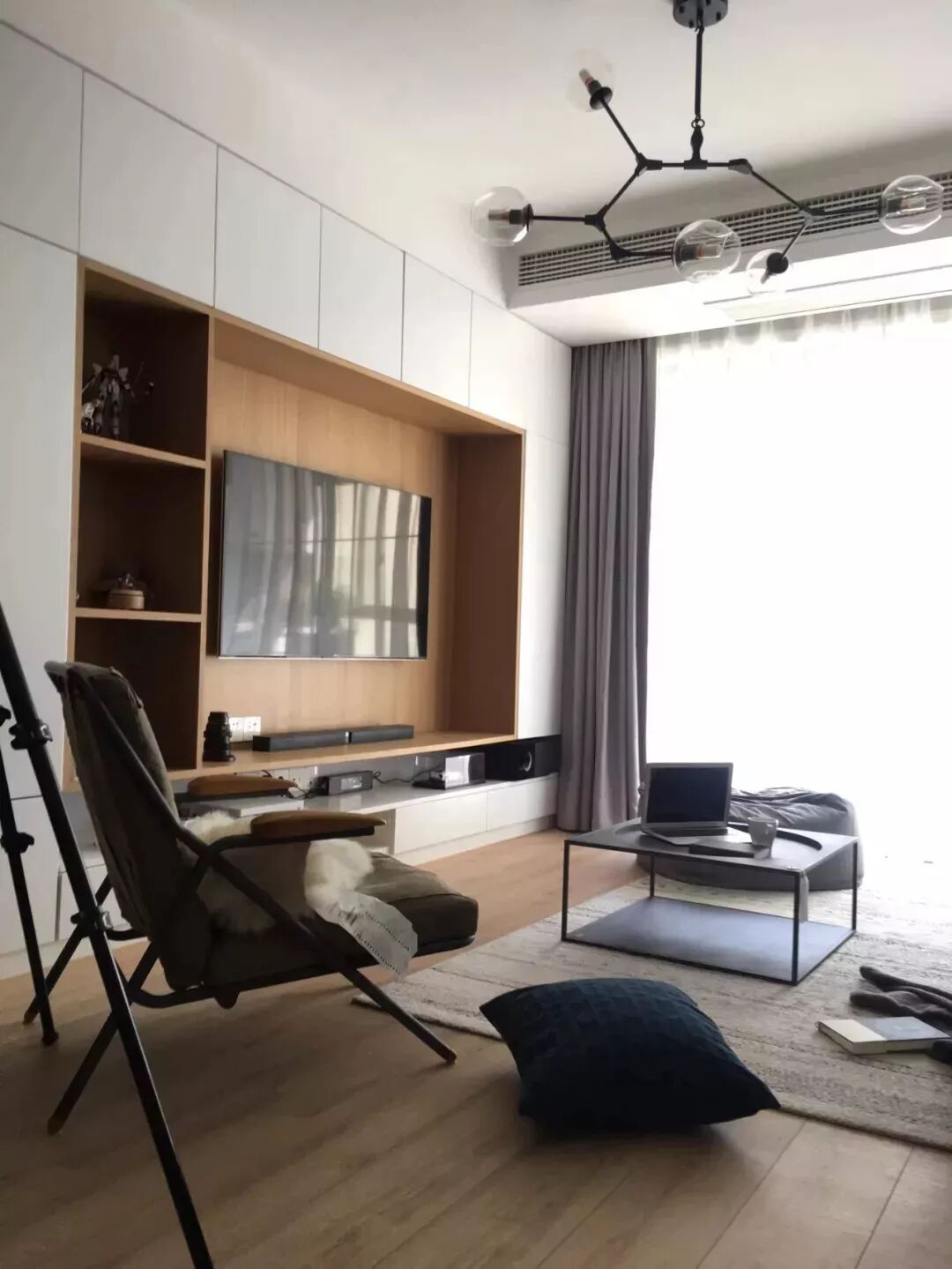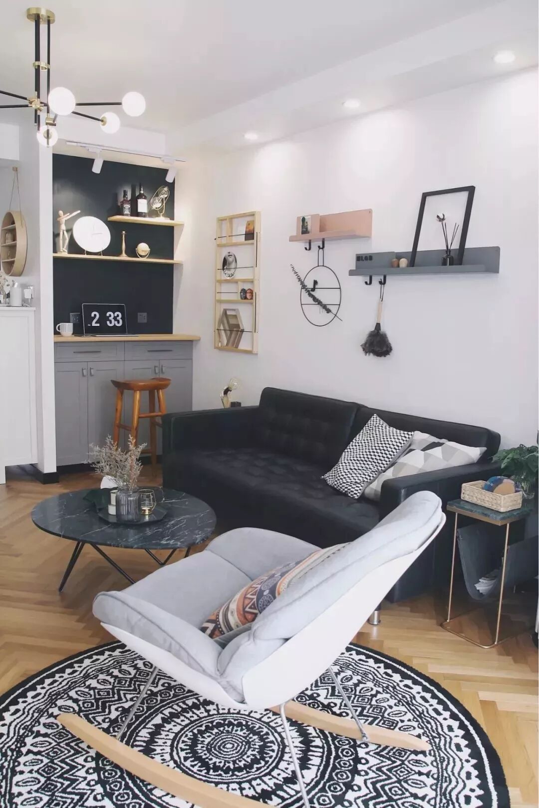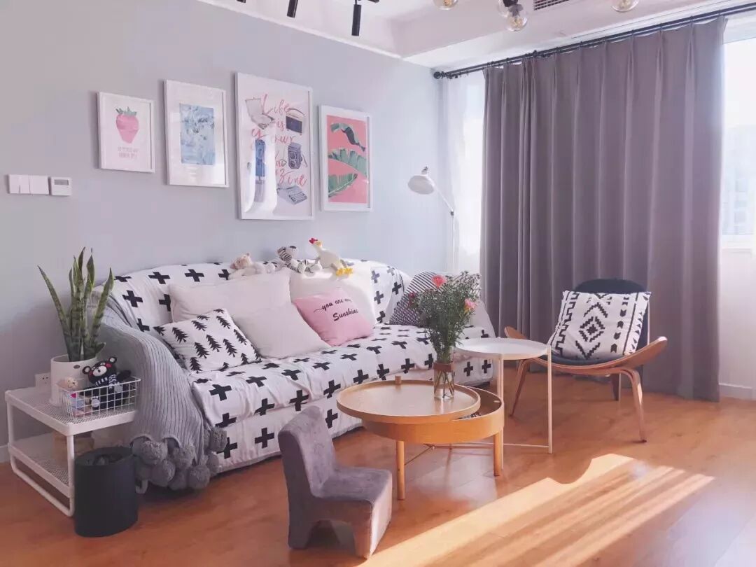 齐家室内姐本人是很喜欢这种茶几的,简洁轻快,尤其适合小户型,只是收纳功能实在是有些欠缺,可以在沙发旁加一个边几。