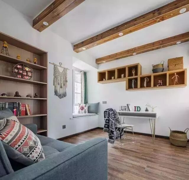 木板自带天然的艺术韵味,代替吊顶,同样有自己独特的气质。而且,不会缩减层高。③巧妙利用横梁设计