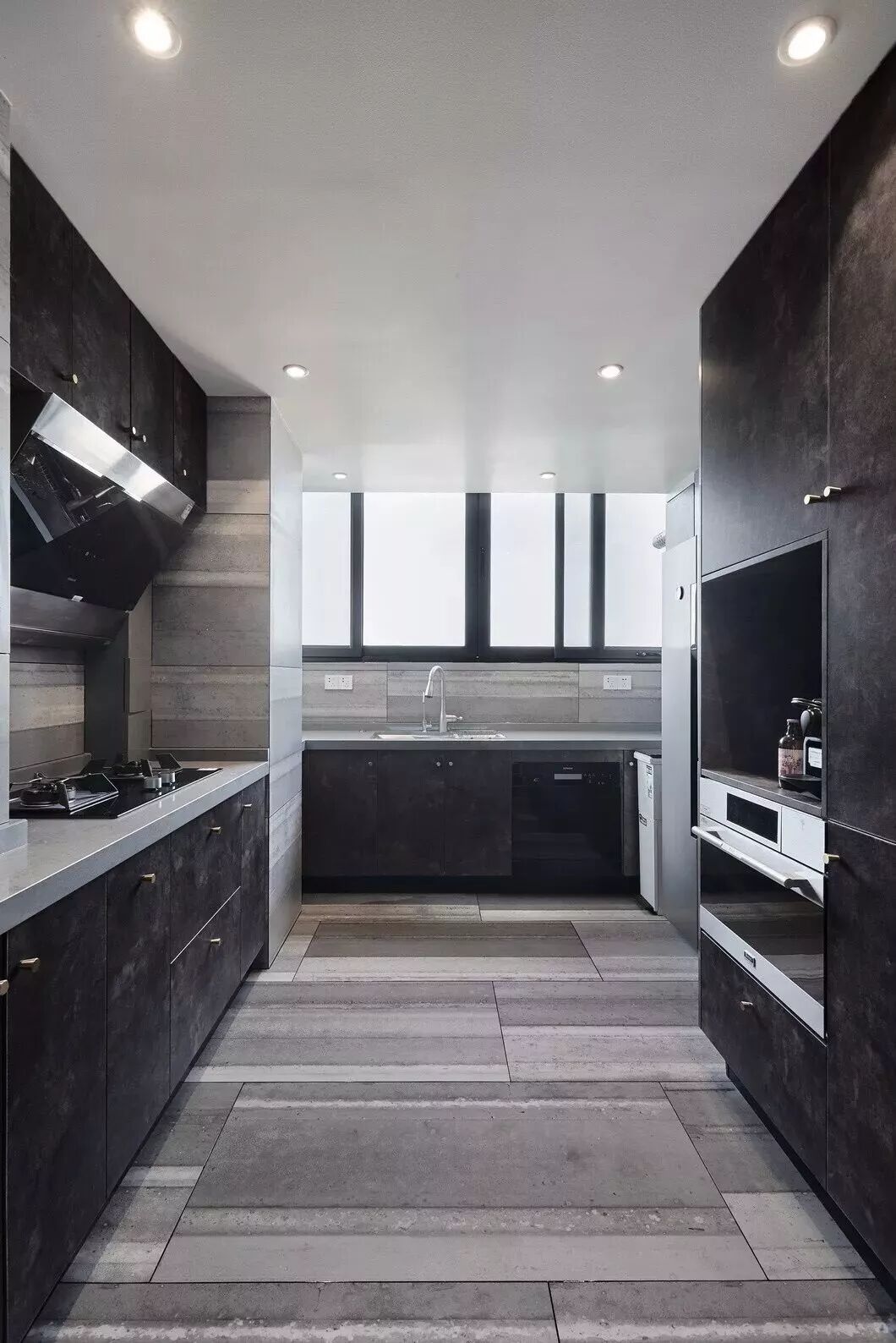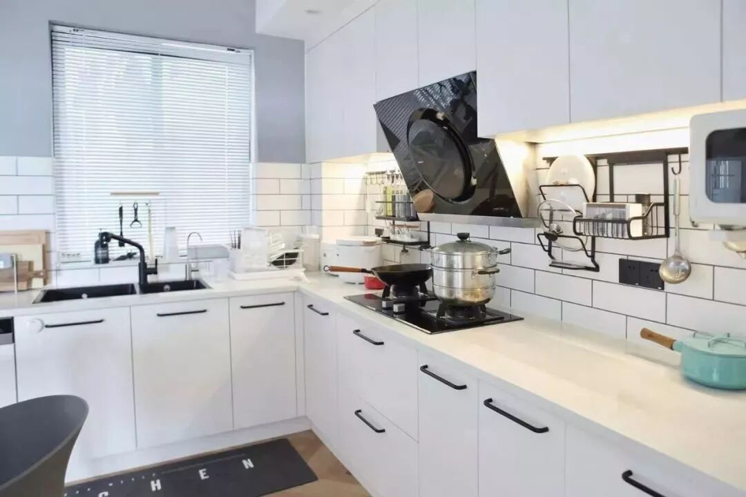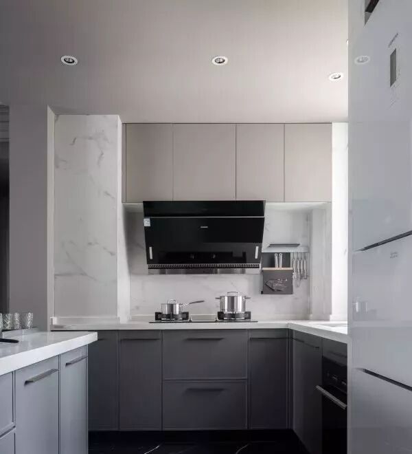 对于不是用铝扣板、而是用石膏板做厨房天花的设计,这种整体较为平整的厨房天花可以选择嵌入天花内部的筒灯,这样简洁的设计效果是比较适合一些文艺、简约类的年轻人的厨房搭配。