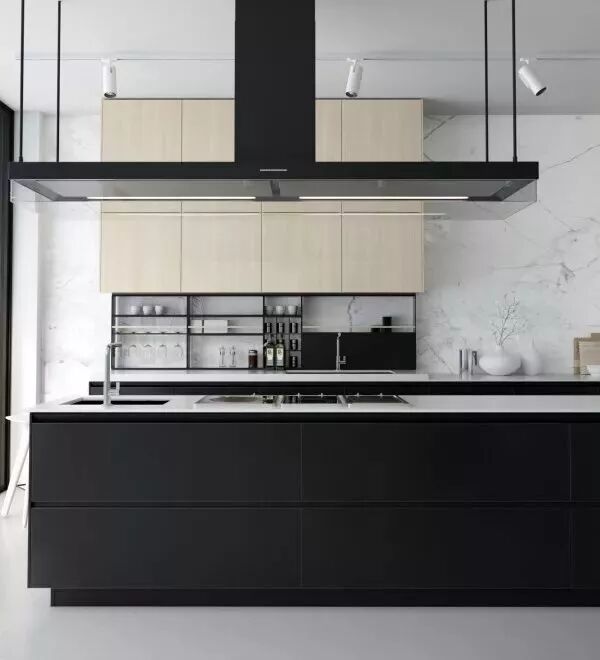 轨道灯也是适合一些开放式的厨房,在一道轨道上装上一串的射灯,能够让光线集中到某些重点操作区域,同时也让厨房明暗分明,层次丰富。
