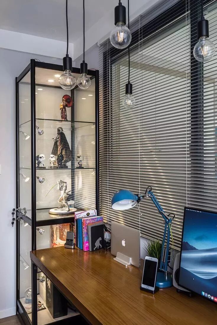 书房与次卧中间做了半墙加玻璃移窗隔断,将书房的光线引入次卧,同时百叶窗帘很好地保障了私密性。内嵌的满墙书柜设计,增加了不少收纳的空间。