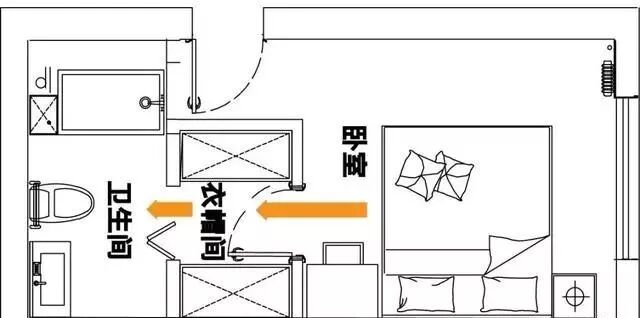二字型衣帽间,最小可以做到2.7㎡,能当通道来使用,尤其当卧室与卫生间联通的时候。