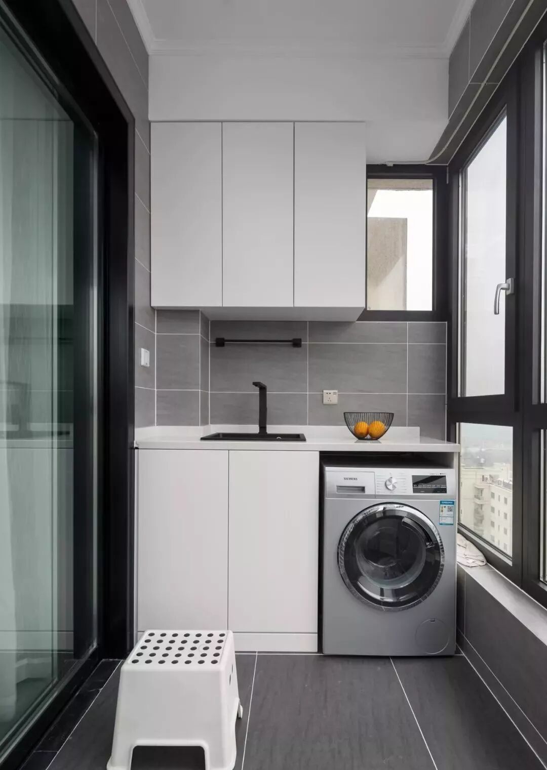 阳台的黑白灰主色调与客厅保持了同步,过渡自然。吊柜设计增加了阳台空间的储物,可以收纳衣架、洗衣液等,也将原有的下水管进行了隐藏处理。