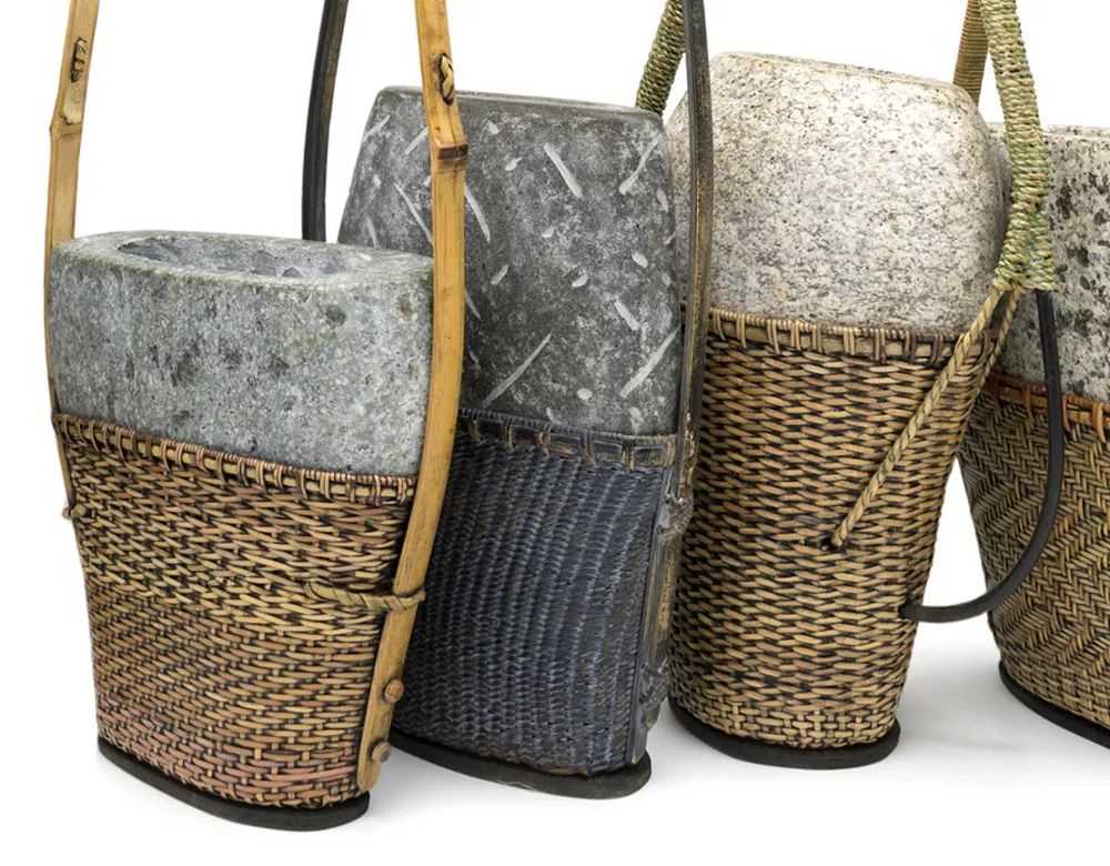 这个系列是向日本编织工艺致敬的作品,采用了传统工艺制作完成。为了凸显材料本身的美,Webber以篮子作为媒介,用了竹条将花岗岩编入其中。虽然这使其失去了篮子的功能,但在视觉上却是引人注目的。