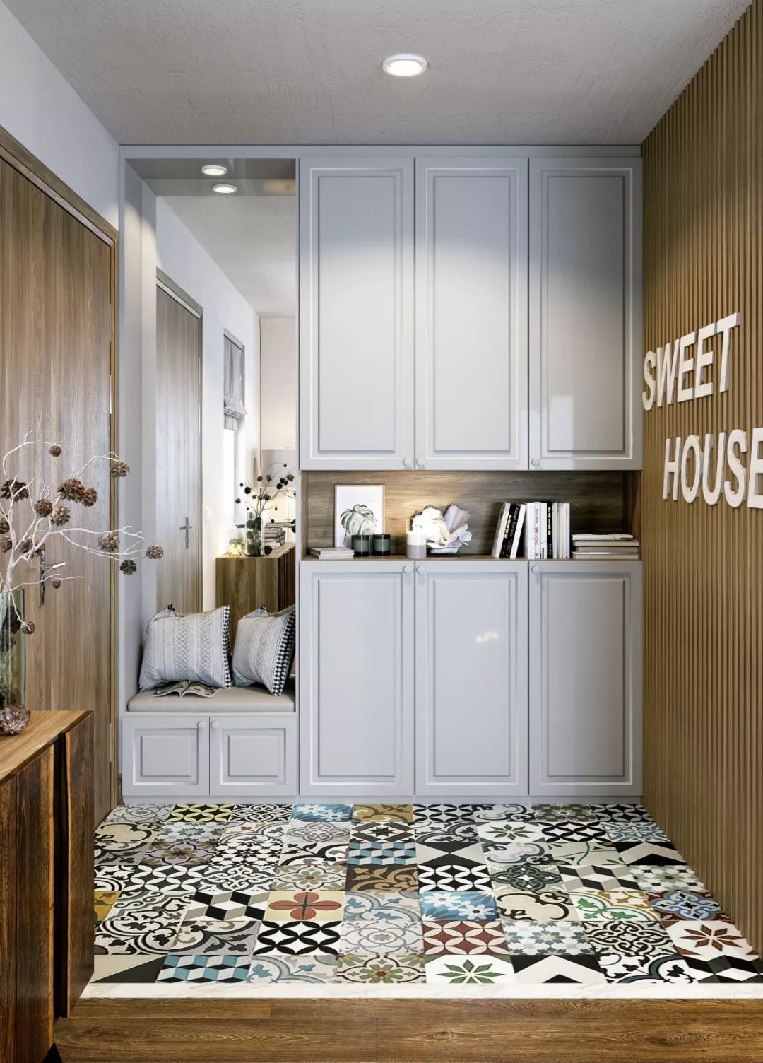 嵌入式壁柜是节省空间的利器,它的外观简约大气,内部收纳空间也很充足,你可以设计成半开放+半封闭的形式,让换鞋凳和收纳区融为一体,整个门厅就不会显得又挤又乱了。