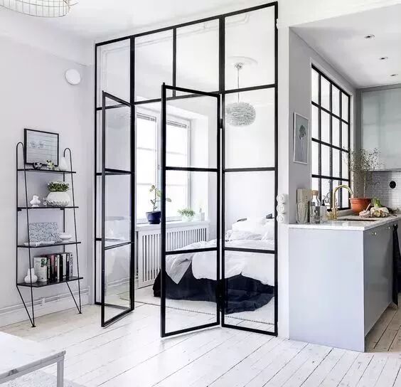 卧室和客厅的分隔,可以选择磨砂质感的玻璃门作为隔断,既可以保证卧室隐私性,还能保证采光,特别适合小户型。