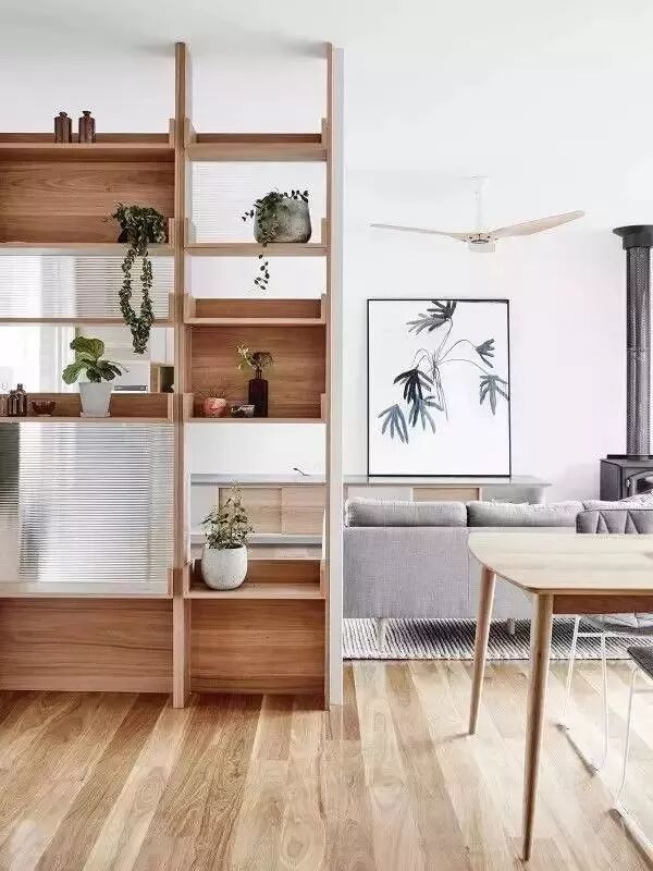 收纳书架也是客厅比较常见的隔断。它的好处是灵活方便,也比较透光,在日后的生活中也可以随意调整。因为不涉及硬施工,尺寸也随意,多放或少放比起砸墙切砖的施工都是省事儿。