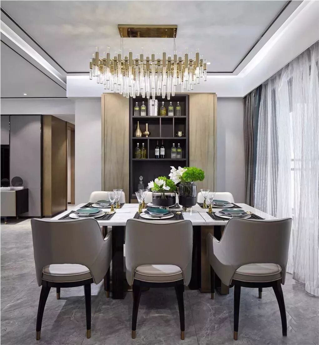 像中式、轻奢简约等比较庄重的风格,则可以选择较为深色的木质感做定制餐边柜,这样搭配出来的空间会显得更加端庄高档。
