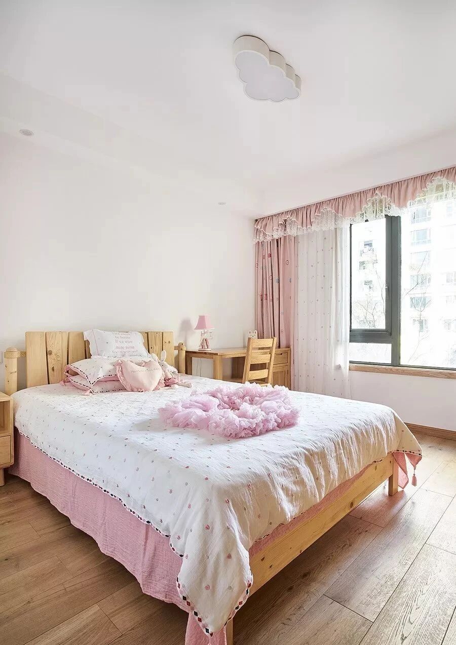 粉色的公主城堡,房间主体部分仍是原木色,易变更部分如床品窗帘,可以根据小朋友的喜好更换。