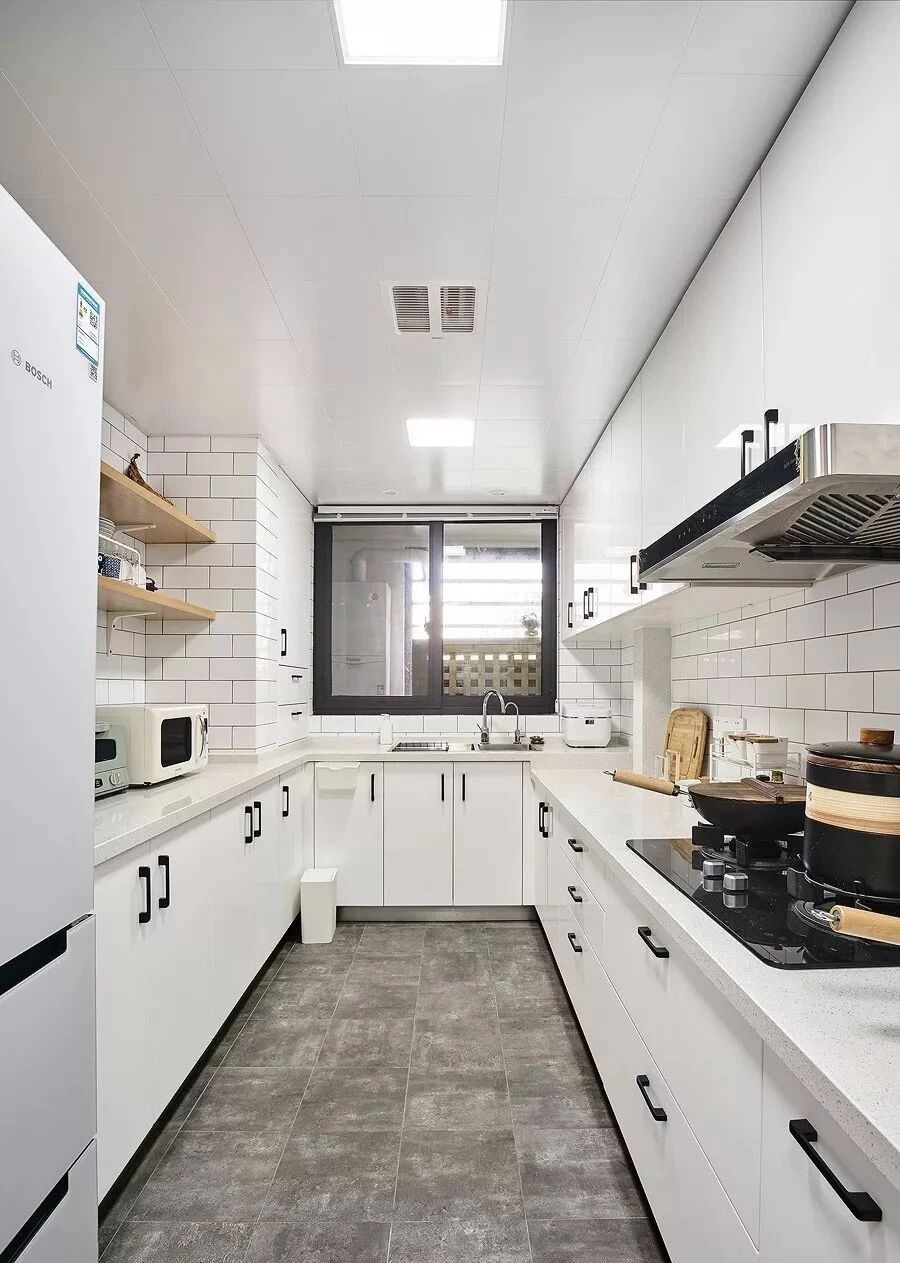 白色的厨房,视觉上大气整洁。大理石地砖,打理起来更加轻松。