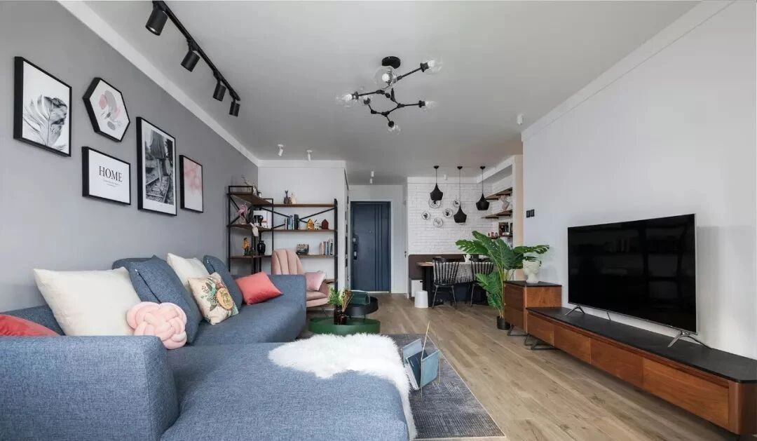 整个空间以灰色为主调,粉色恰到好的点缀,让冷调的空间多了几分柔美感。新北欧式转角式蓝色沙发,去掉大茶几换上圆形小茶几,看起来清爽多了。