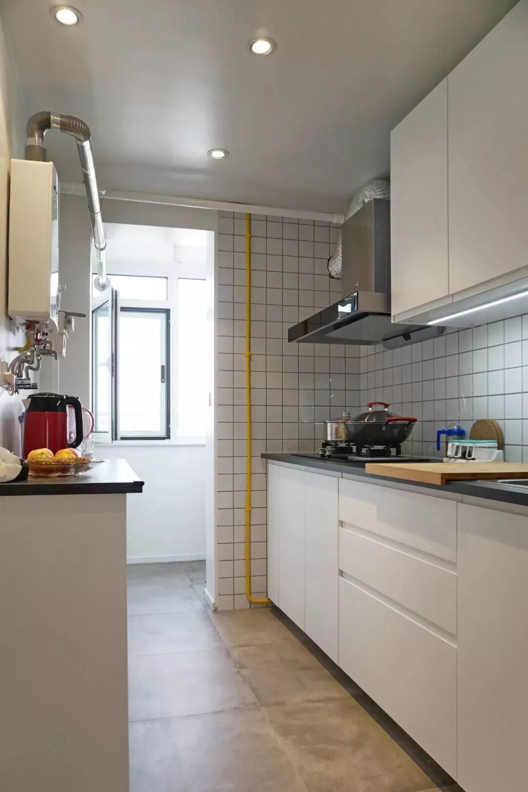 宽度小于1.4米、长度大于1.4米,只有这样的厨房,才具备装成L形格局的条件,而具体的布置设计,还需要结合现场的管道位置来定。
