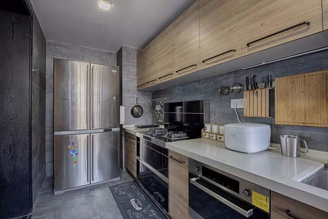 相比一字形厨房,二字形的厨房通常都较为宽敞方正,实用性较强;之所以不做成U形的,一般是因为长度不足或则挨着有生活阳台的门,无法做多一面的操作台,不过这样的厨房也是已经挺好用了。