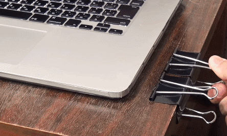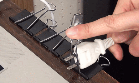 办公桌上线路太多,不仅混乱还不美观,几个长尾夹还你清爽桌面!把长尾夹夹在书桌边,将数据线穿过手柄处。